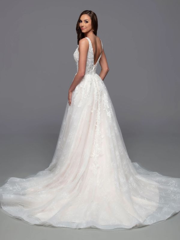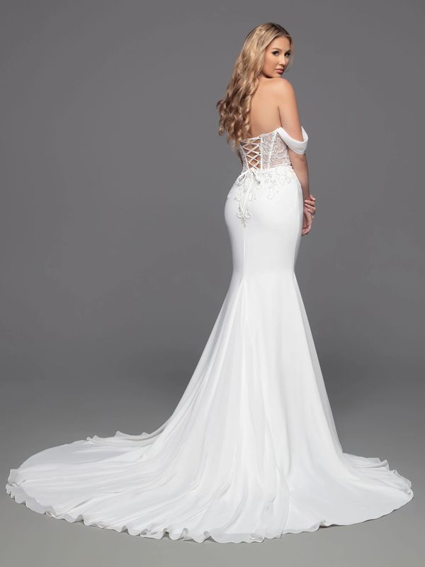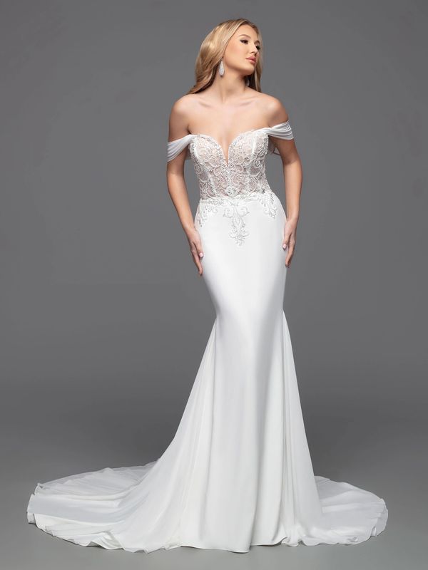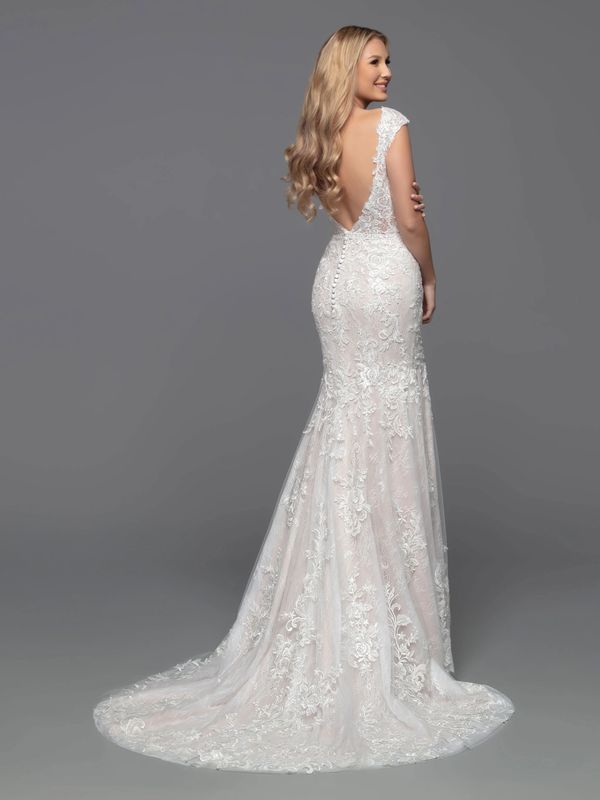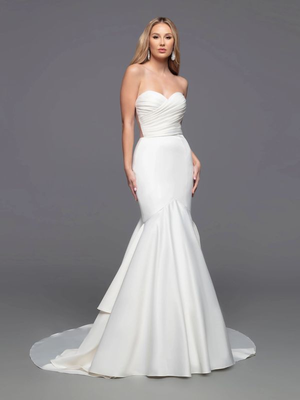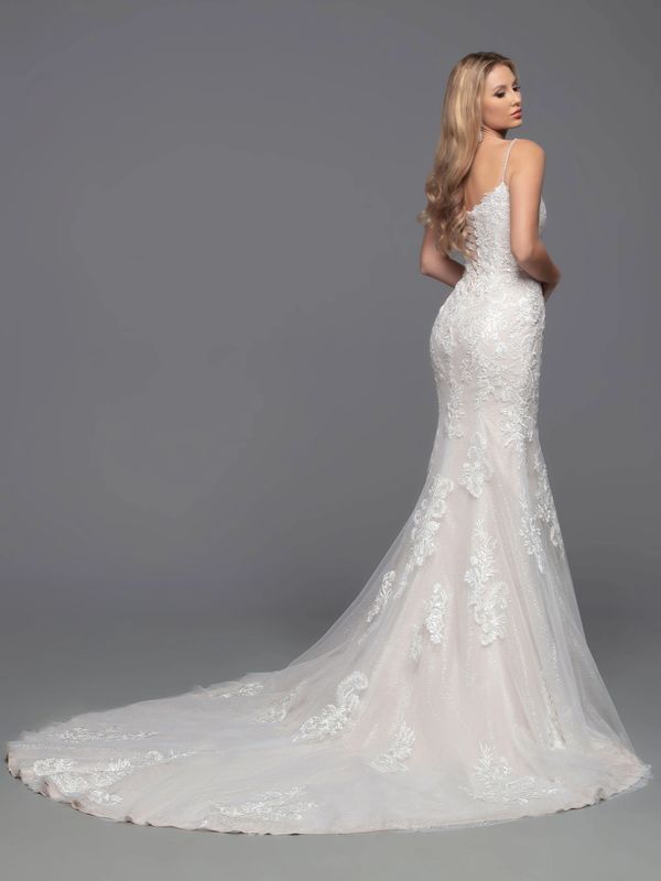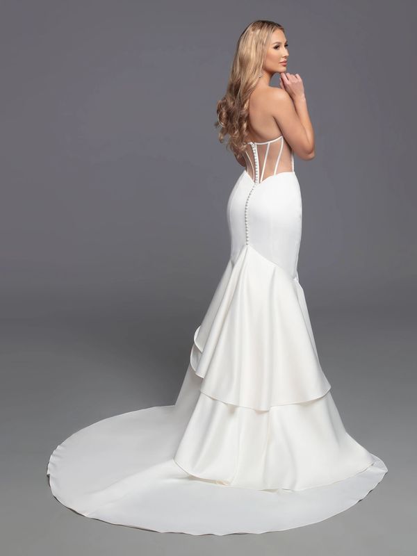 Satin Mermaid gown with beaded ivory lace over skin tulle unlined bodice, beaded straps, buttons to end of train.