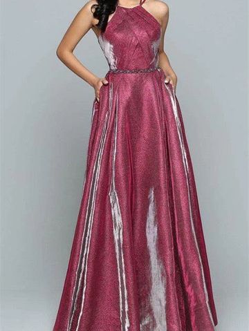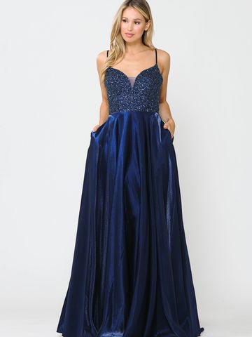 This dark blue A-line gown features a stunning iridescent shimmer satin fabric, complemented with pockets in the skirt. A beaded sweetheart neckline top with a corset back.