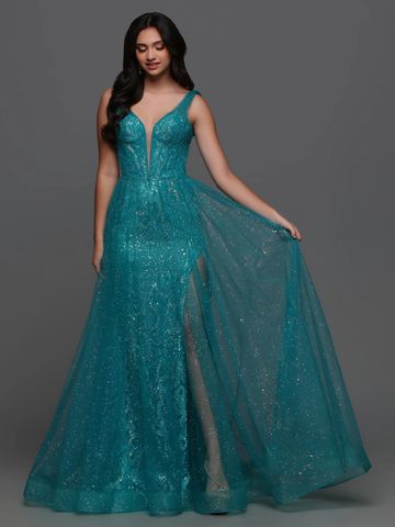 This classic glitter tulle prom dress holds a sweet surprise. The sheer top layer lends a ball gown feel to the fit & flare underdress with its pretty peek-a-boo slit skirt.