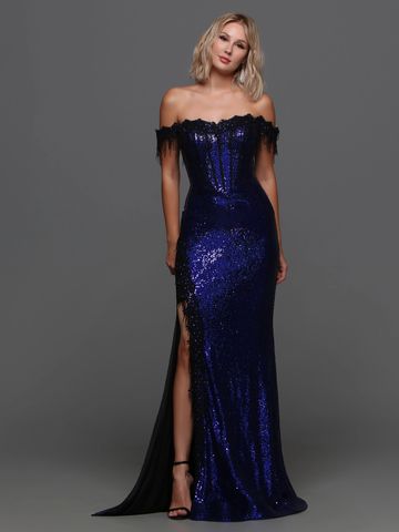 Up to the minute with a vintage vibe, this sequin fit & flare features a lingerie-inspired bodice with an open corset back. Sequin lace with beaded fringe frames the neckline & traces the length of the high slit skirt & sheer side panel.
