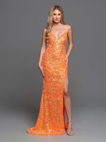Long sequin fitted dress with sheer side cutouts, deep V-neckline, front leg slit and open V-back.