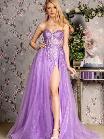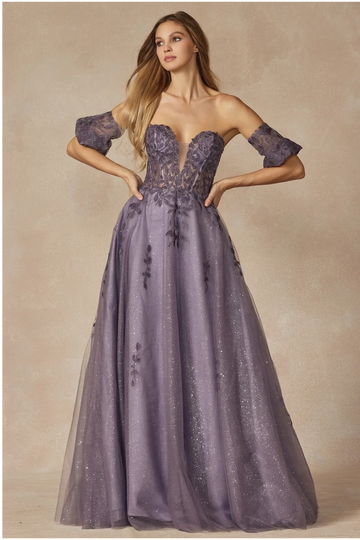 Off the shoulder A-Line gown with a split. Has a corset back.